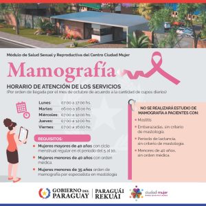 Durante este mes, en el contexto de Octubre Rosa, en el Centro Ciudad Mujer – Ñande Kerayvoty Renda, la atención para estudios de mamografías se realizará por orden de llegada, de acuerdo con la cantidad de cupos diarios que se maneja en el Módulo de Salud Sexual y Reproductiva, dependiente del Ministerio de Salud Pública a cargo del Hospital General de Villa Elisa.